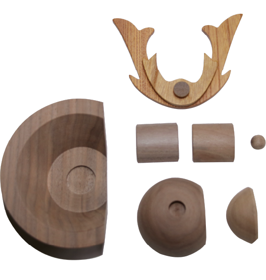 デザイナーさんからの依頼です。 無垢の木を削り出して各パーツを制作。 こちらはセットした状態で納品させていただいております。